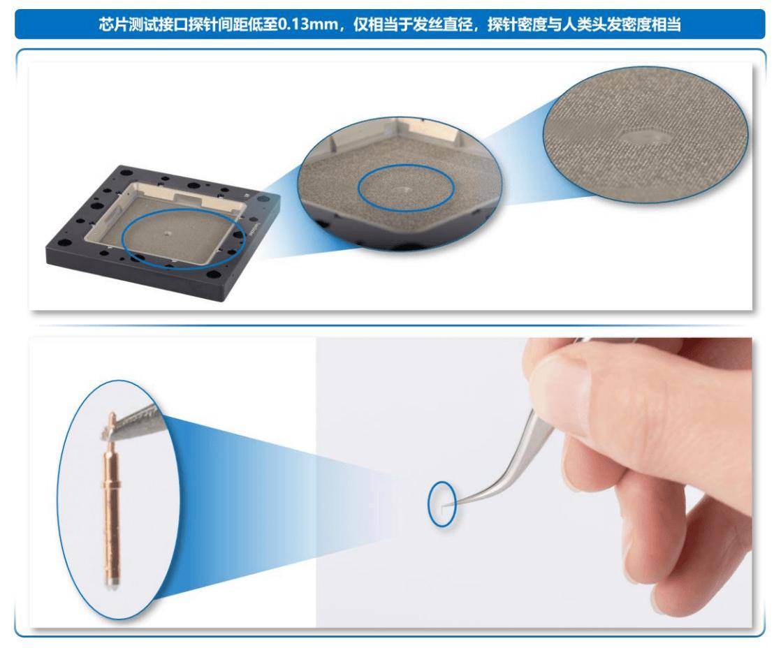 在精度方面,其芯片测试接口最高可装配近30000根测试探针,探针间距低至0.13mm,这一距离仅相当于人类发丝直径,相当于芝麻粒大小的面积内植入超过30根测试探针,能够充分满足CPU、GPU、AI芯片等先进高引脚密度数字芯片的测试需求。