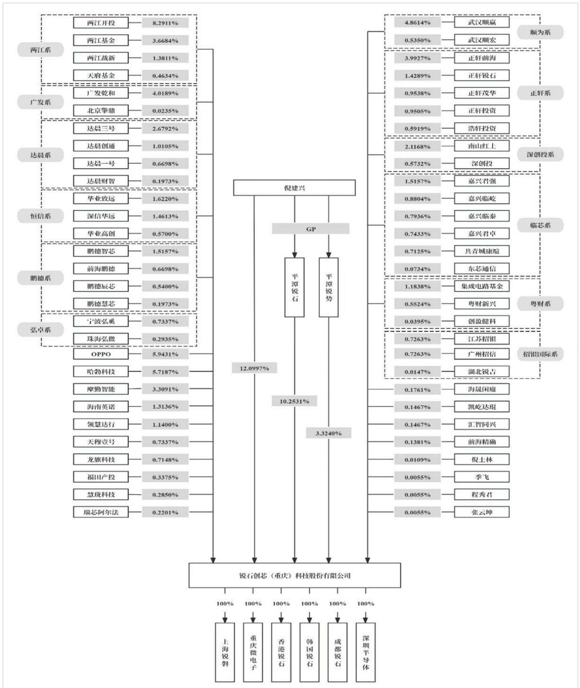 锐石创芯的其他知名股东包括OPPO(持股5.9413%)、华为旗下哈勃科技(持股5.7187%)、雷军旗下顺为系资本(持股5.3964%)等等。深创投、重庆两江资本等国资也持有锐石创芯的股份。