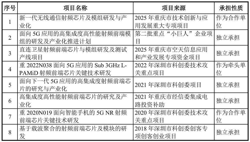 锐石创芯曾多次承担省级、市级重大科研项目,已经完成或正在承担的重大科研项目如下: