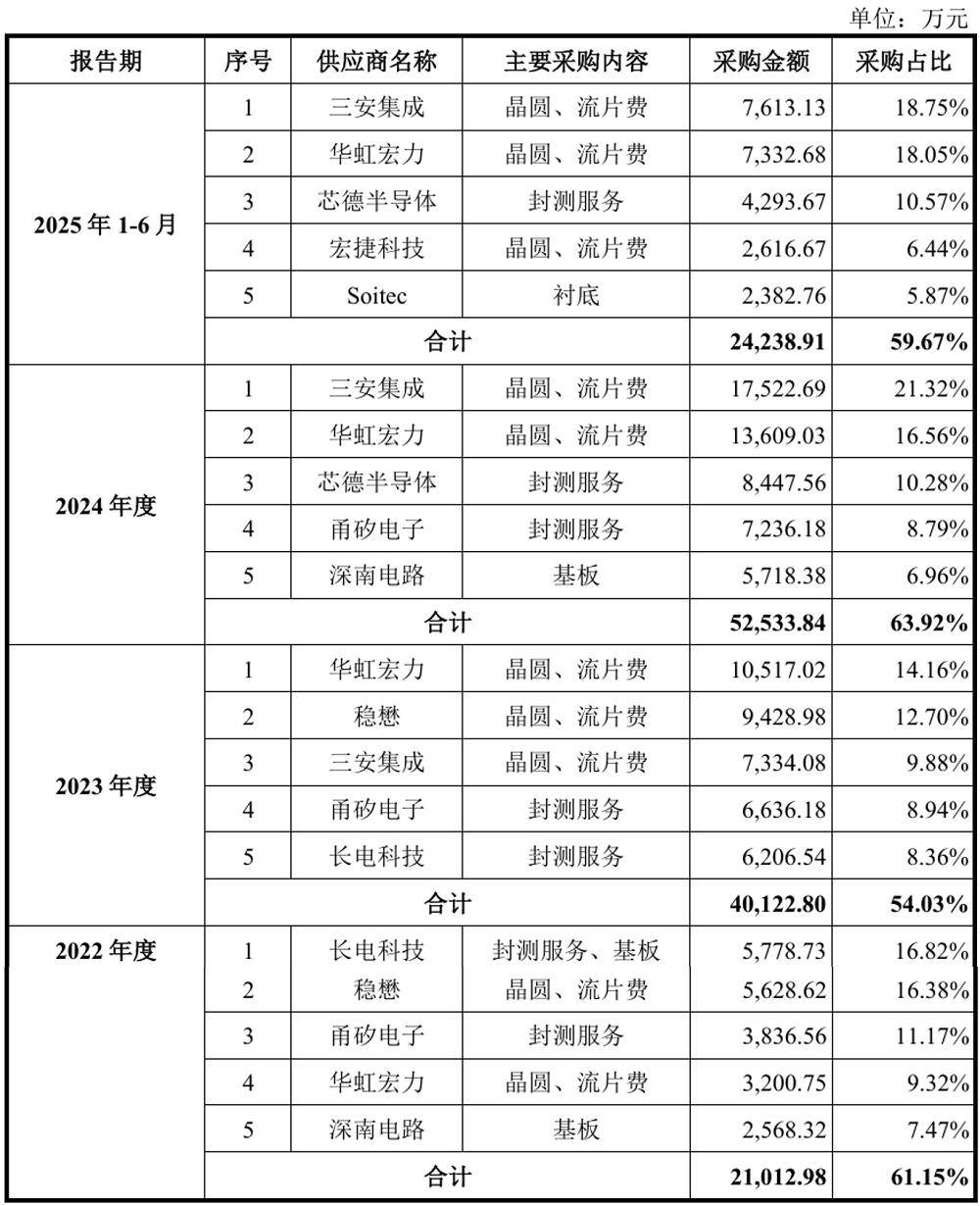 在晶圆采购方面,其主要供应商包括三安集成、华虹宏力、芯联集成等中国境内晶圆厂商及宏捷、稳懋、台积电等知名境外晶圆厂商。基板采购方面,锐石创芯的主要供应商为深南电路、珠海越亚、厦门四合、兴森科技等。