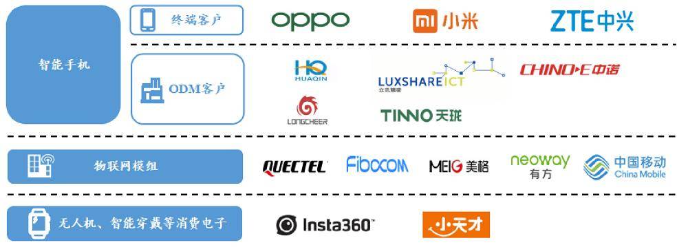 在移动智能终端领域,其产品应用于OPPO、小米、中兴、vivo、荣耀、三星、传音等知名手机品牌,并进入华勤技术、龙旗科技、天珑移动、立讯精密、闻泰科技、富士康等一线移动终端设备ODM厂商,以及小天才、小寻等智能穿戴设备厂商供应链体系。
