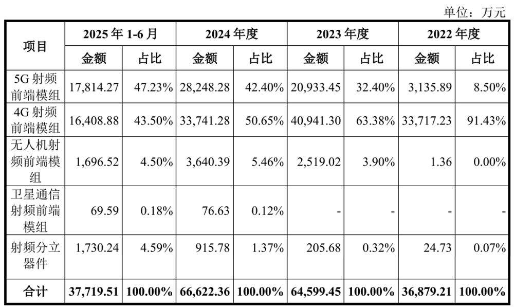 报告期内,锐石创芯主要销售5G射频前端模组与4G射频前端模组。5G射频前端模组的销售额占比从2022年度的8.5%涨至2025年1-6月的47.23%,同期4G射频前端模组的销售额占比从91.43%降至43.5%。