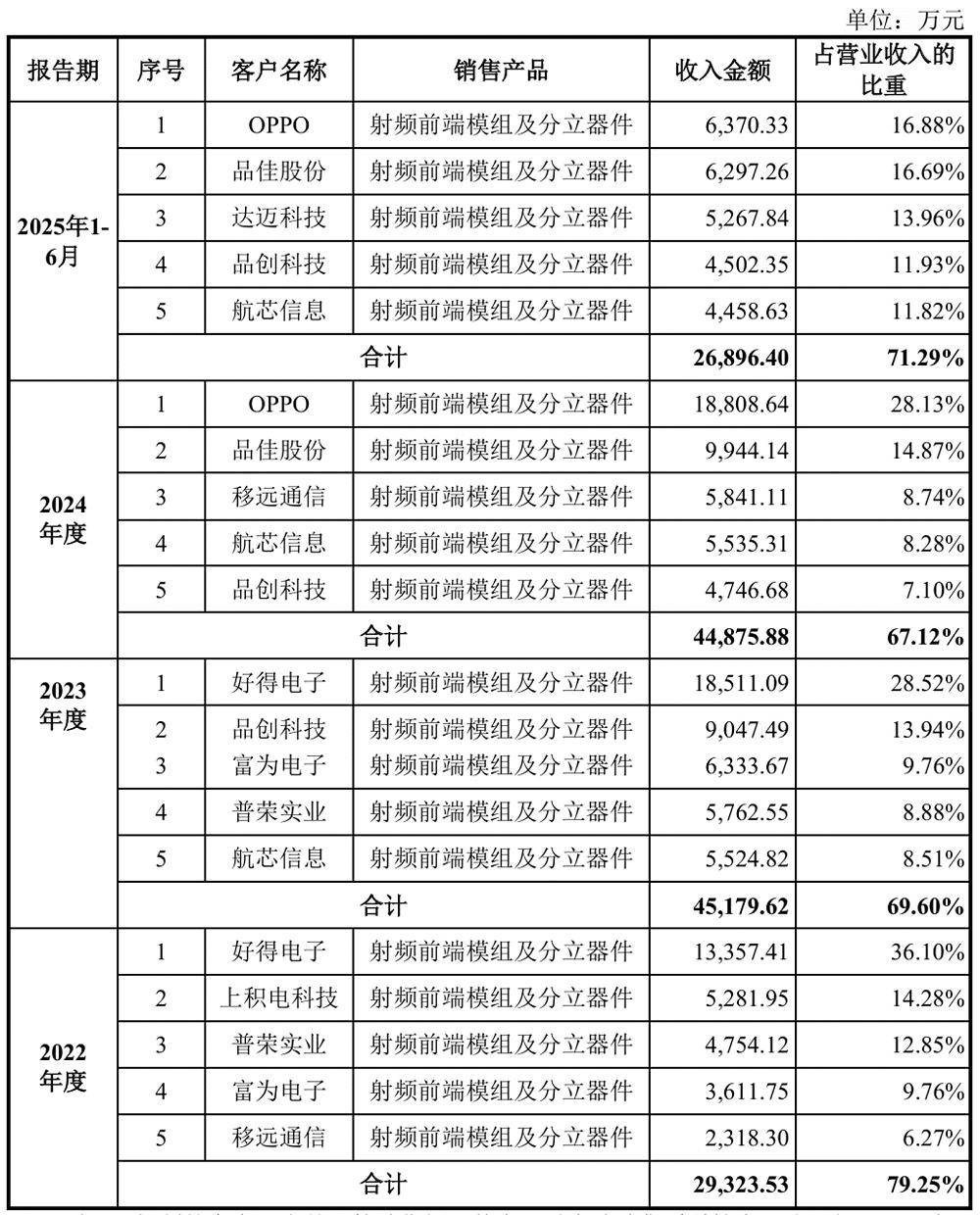 2024年-2025年6月,OPPO是锐石创芯的最大客户,锐石创芯主要向OPPO销售射频前端模组和分立器件。