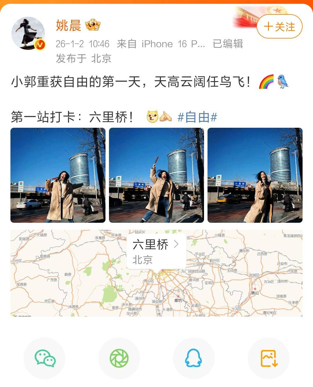 “小郭重获自由的第一天,天高云阔任鸟飞!第一站打卡:六里桥!”1月2日,演员姚晨的微博一下子给全网的《武林外传》迷们来了个新年回忆杀,“郭芙蓉自由了”“二十年快得很,弹指一挥间”冲上热搜。