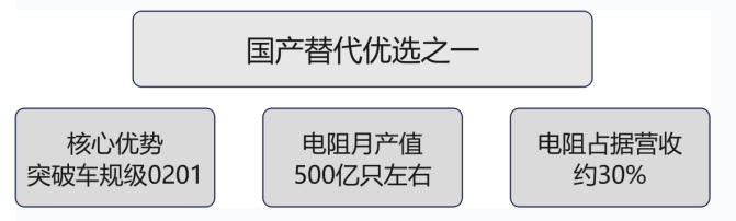 通过 IATF16949 认证,已实现 0201 / 抗硫化电阻量产,是国内电阻市场的新兴力量,近期制定5年上市计划。