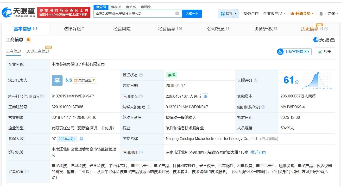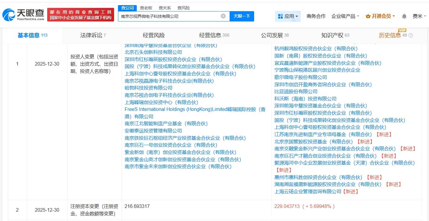 天眼查工商信息显示,近日,南京芯视界微电子科技有限公司发生工商变更,新增蚂蚁集团旗下上海云玚企业管理咨询有限公司、江苏南京先进制造产业专项母基金(有限合伙)等为股东,同时,注册资本由约217万人民币增至约229万人民币。