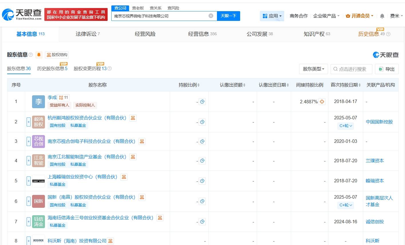 南京芯视界微电子科技有限公司成立于2018年4月,法定代表人为李成,经营范围包括从事半导体科技电子产品领域内的技术开发、技术转让、技术咨询和技术服务等。股东信息显示,该公司现由李成、杭州毅鸿股权投资合伙企业(有限合伙)及上述新增股东等共同持股。官网显示,该公司主营基于单光子探测的一维和三维ToF传感芯片。