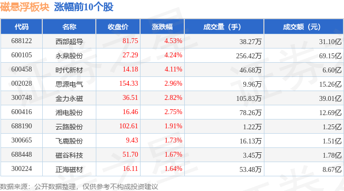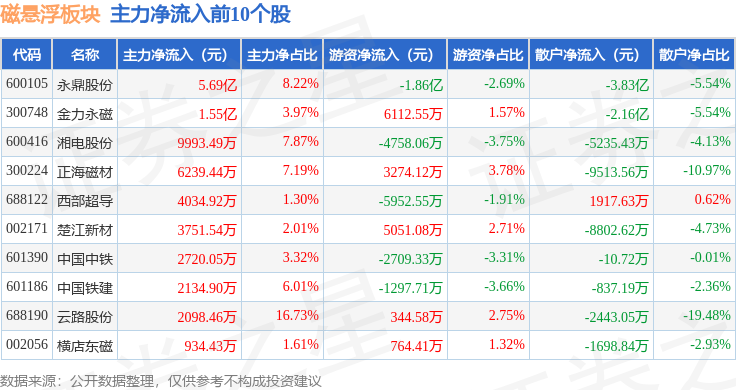 从资金流向上来看,当日磁悬浮板块主力资金净流入3.99亿元,游资资金净流出5887.18万元,散户资金净流出3.41亿元。磁悬浮板块个股资金流向见下表: