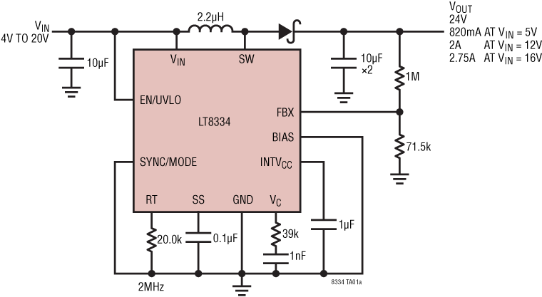 The LT8334 is a current mode DC/DC converter with a 40V, 5A switch operating from a 2.8V to 40V input. With a unique single feedback pin architecture, it is capable of boost, SEPIC or inverting configurations. Burst Mode operation consumes as low as 9μA quiescent current to maintain high efficiency at very low output currents, while keeping typical output ripple below 15mV.