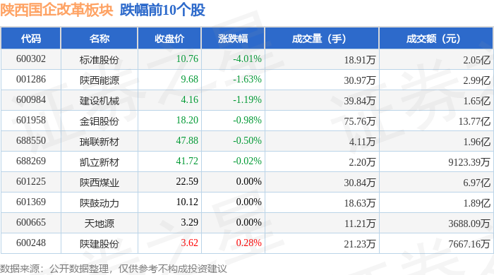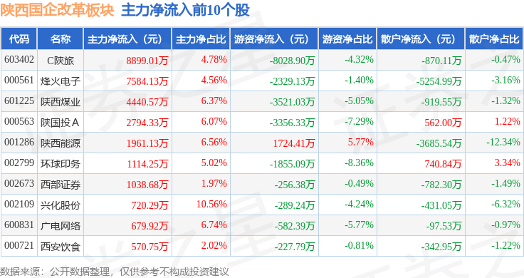 从资金流向上来看,当日陕西国企改革板块主力资金净流出3.84亿元,游资资金净流入6911.05万元,散户资金净流入3.15亿元。陕西国企改革板块个股资金流向见下表: