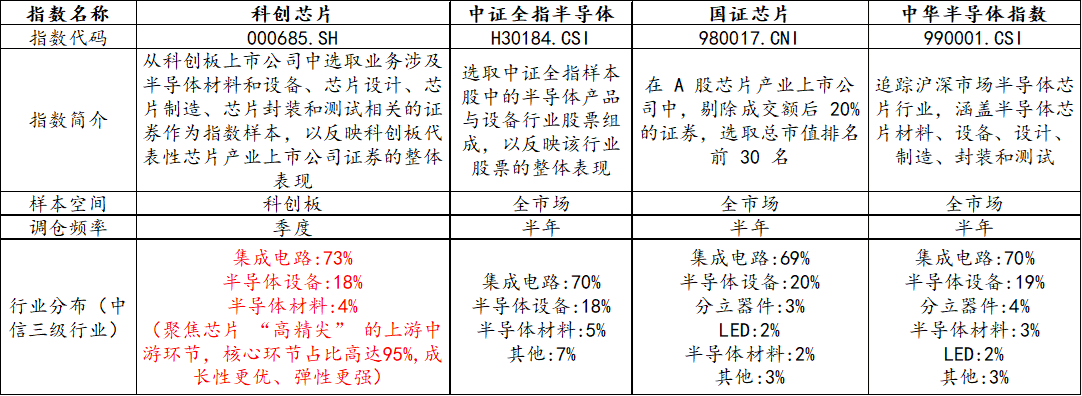 市场上芯片相关指数众多,选取当下热门的科创芯片、半导体等指数进行比较,可以发现,虽然均聚焦为芯片板块,但在指数编制上却大有不同。一句话总结:科创芯片指数聚焦芯片核心环节,“含芯量”更高,弹性强,成长性高。
