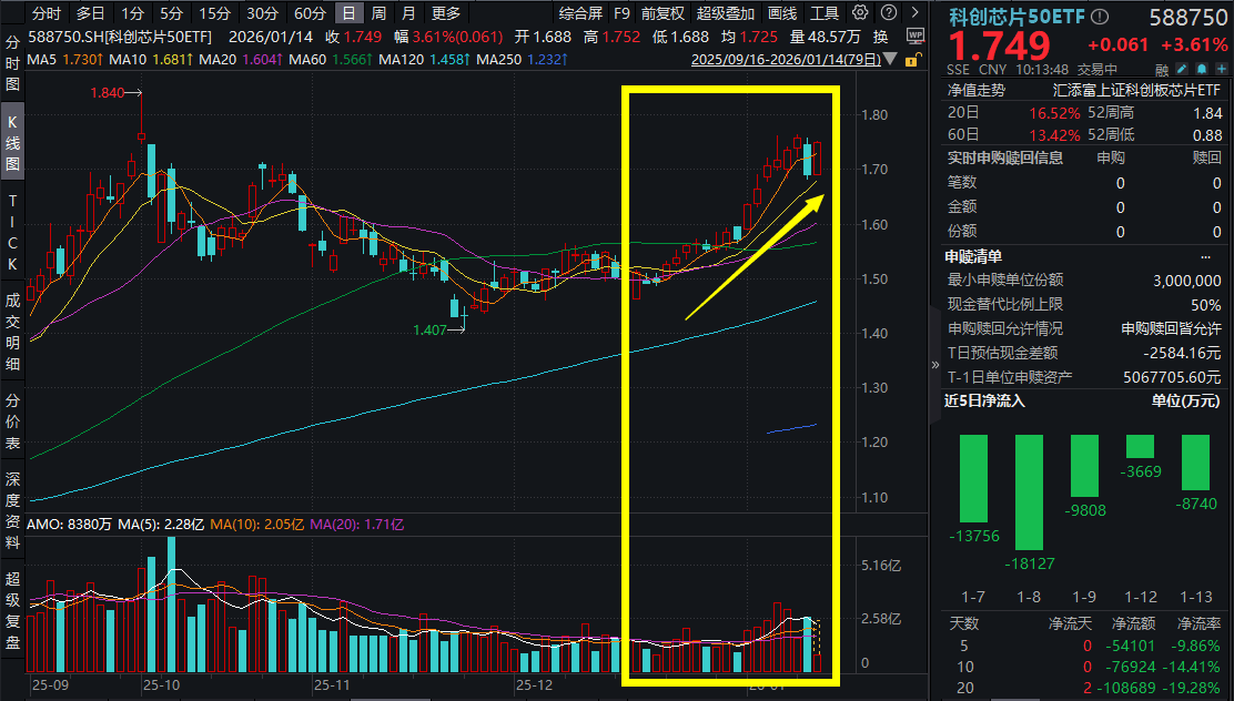 1月14日,A股市场震荡上行,科创芯片板块强劲反弹!科创芯片50ETF(588750)涨超3.6%,强势反包昨日跌幅。