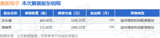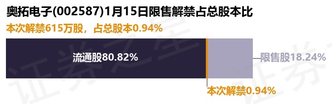 证券之星消息,根据市场公开信息整理,奥拓电子(002587)于1月15日将有615.0万股限售股份解禁,为公司定向增发机构配售股份,占公司总股本0.94%。(本次数据根据历史公告整理得出,实际情况以上市公司最新公告为准)本次解禁后,公司还有1.19亿股限售股份,占总股本18.24%。具体如下图所示: