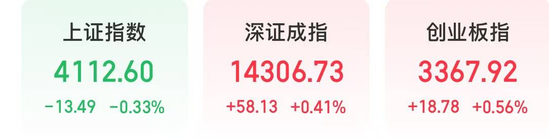 今天,A股分化。截至收盘,上证指数下跌0.33%,深证成指上涨0.41%,创业板指上涨0.56%。