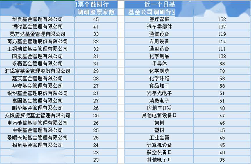 近一个月(12月16日-1月15日),华夏基金参与公司调研的数量最多,共调研45家上市公司,此外调研较为活跃的还有博时基金、易方达基金和南方基金,分别调研41家、33家、32家上市公司;从调研行业上来看,基金公司对医疗器械行业的上市公司调研次数最多,共有152次,其次是汽车零部件行业,基金公司调研了137次。