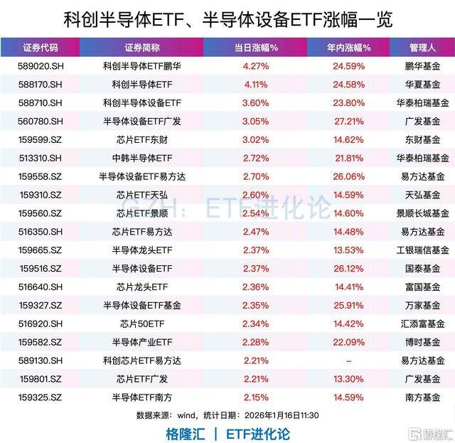 ETF方面,科创半导体ETF鹏华、科创半导体ETF涨超4%;科创半导体设备ETF、半导体设备ETF广发、芯片ETF东财涨超3%;中韩半导体ETF、半导体设备ETF易方达、芯片ETF天弘、芯片ETF景顺、芯片ETF易方达、半导体龙头ETF、半导体设备ETF、芯片龙头ETF、半导体设备ETF基金、芯片50ETF、半导体产业ETF、科创芯片ETF易方达、芯片ETF广发、半导体ETF南方涨超2%。