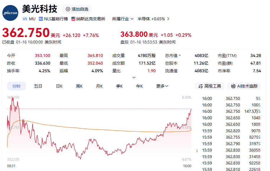 1月16日,美光科技大涨7.76%,报362.75美元/股,总市值为4083亿美元(约合人民币2.85万亿元)。消息面上,美光科技在纽约州奥农达加县破土动工建设价值1000亿美元的存储器制造综合体。该制造中心将建设多达四座工厂,致力于打造全球最先进的存储半导体生产基地,以满足人工智能等领域日益增长的需求。