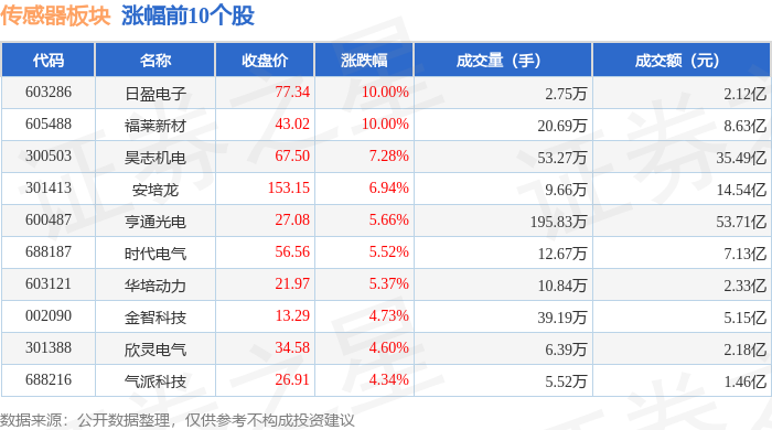 证券之星消息,1月19日传感器板块较上一交易日上涨0.17%,日盈电子领涨。当日上证指数报收于4114.0,上涨0.29%。深证成指报收于14294.05,上涨0.09%。传感器板块个股涨跌见下表: