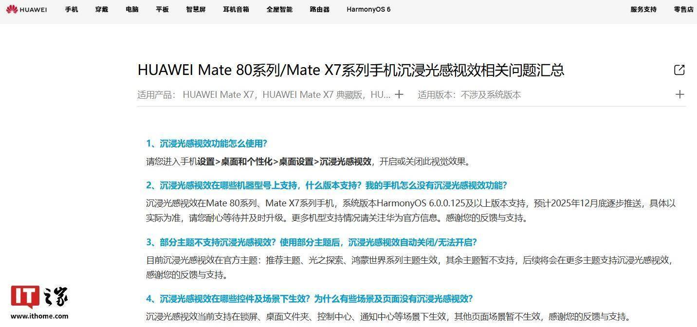华为官网显示,沉浸光感视效可自主选择开启或关闭,会在 Mate 80 系列、Mate X7 系列手机,系统版本 HarmonyOS 6.0.0.125 及以上版本支持。