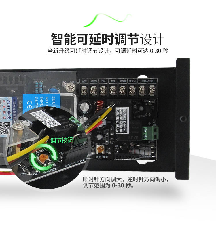 0-30 秒延时可调,适配多锁型支持 0-30 秒延时断电调节,完美匹配磁力锁、电插锁等不同门禁锁具,开门后延时断电防夹伤,也能按需调至即时断电,适配办公速通、小区入户等不同使用需求,灵活适配不挑锁。