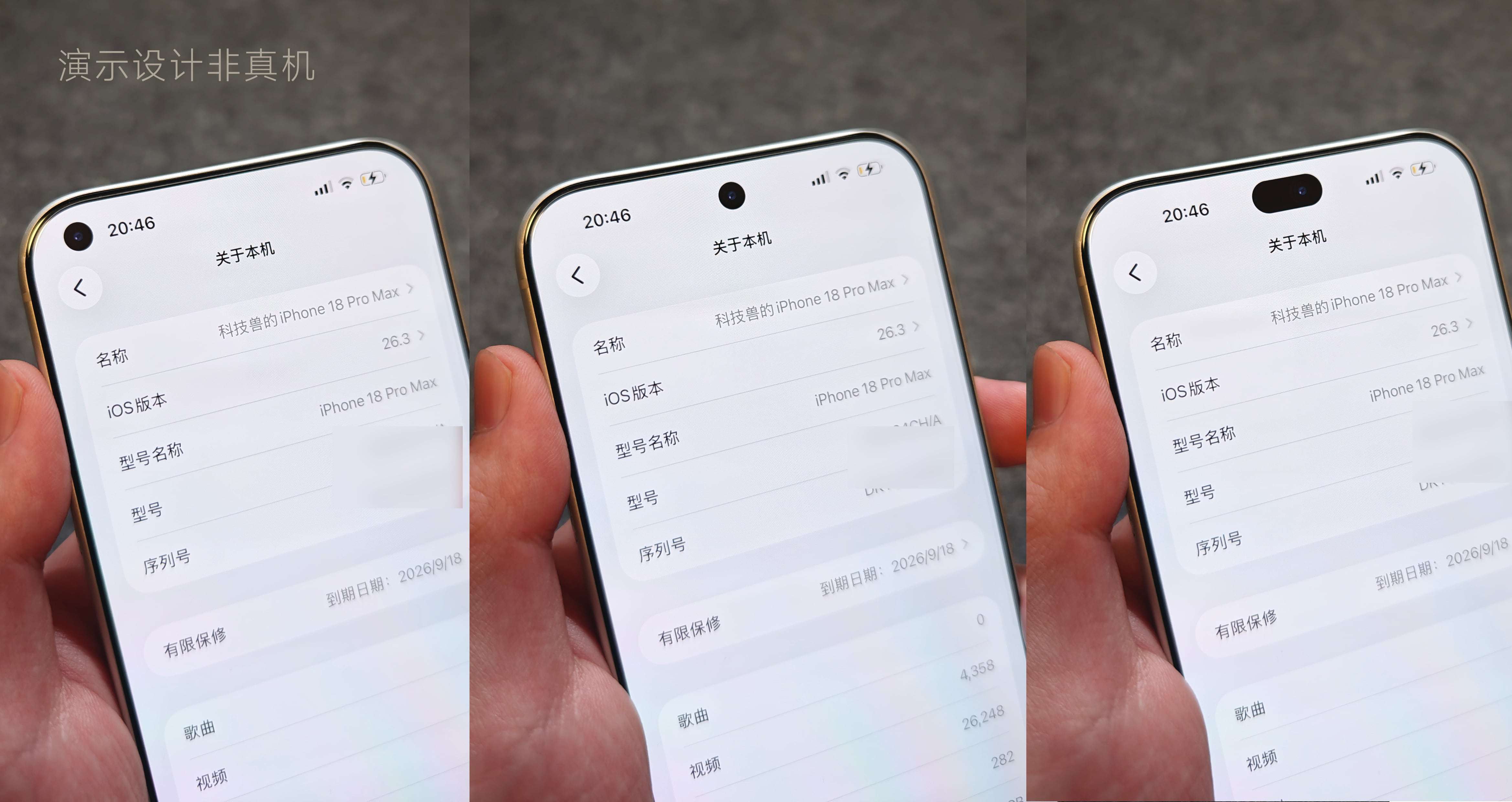 如果说 iPhone 18 Pro 目前在外形上的最大悬念是什么,那无疑还是屏幕挖孔方案。左上角单孔?居中单孔?还是缩小灵动岛?不同方案的视觉风格差异非常明显,也会直接影响整机的观感体验。