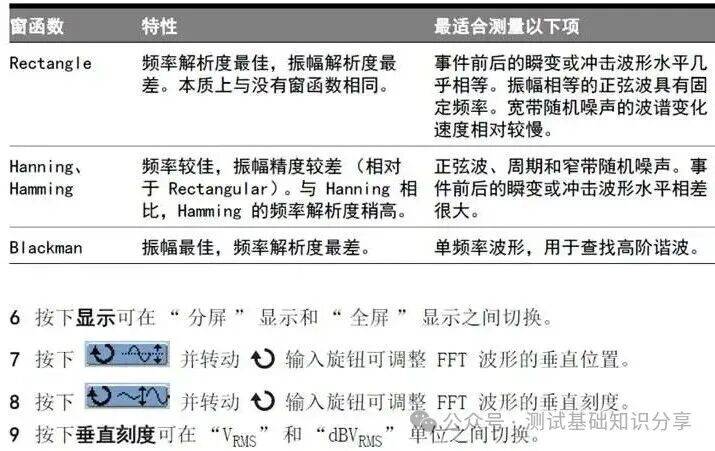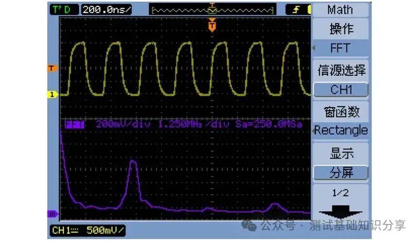 在示波器上,启用FFT后,屏幕的横轴将从“时间”变为“频率(Hz)”,纵轴通常为“幅度”(Vrms或dBVrms)。这使得我们能够直观地看到信号的频谱分布。