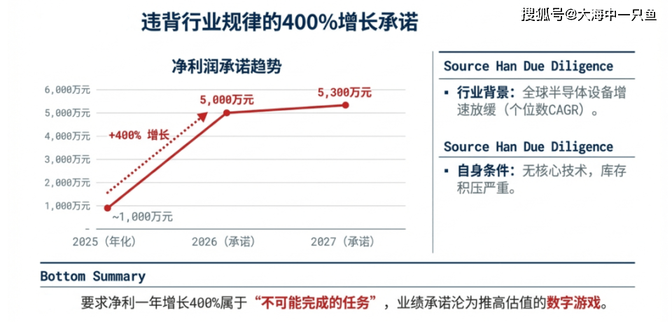 业绩断层:标的公司2025年1-9月净利润仅为780万元,年化约1,000万元。要实现2026年5,000万元的承诺业绩,意味着净利润需在一年内增长400%。在缺乏核心技术支撑、行业竞争加剧、全球半导体设备市场增速放缓(预计CAGR为个位数)的大环境下,这种爆发式增长几乎是不可能完成的任务。