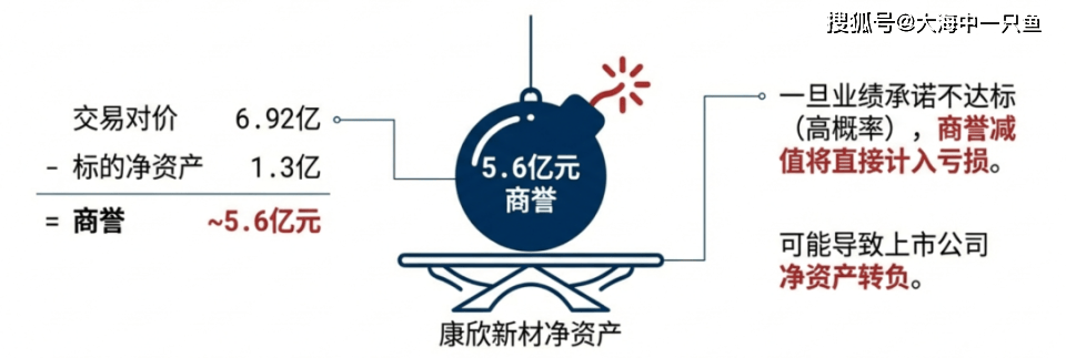 本次交易预计将产生约5.6亿元的商誉(6.92亿对价 - 1.3亿净资产)。对于康欣新材而言,这是一颗巨大的定时炸弹。一旦标的公司业绩未达标(考虑到400%的增长要求,概率极高),上市公司将面临巨额的商誉减值计提。
