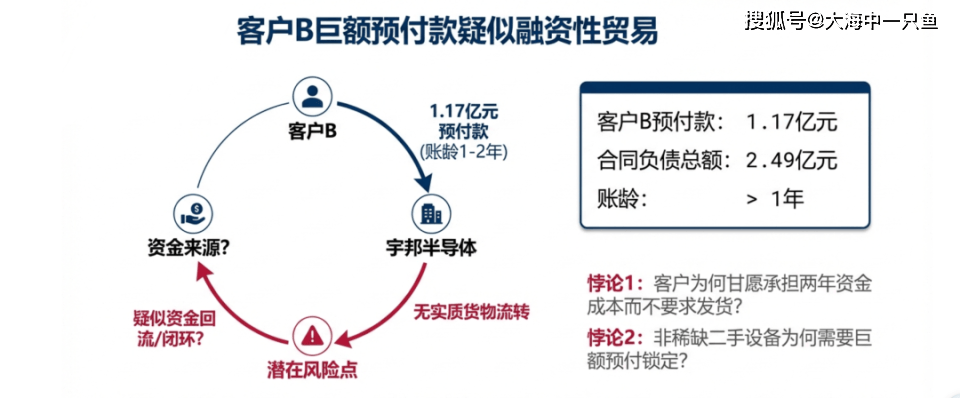这种“大额预付、长期挂账、无实质货物流转”的特征,高度符合融资性贸易的典型架构。即标的公司可能并未进行真实的设备销售,而是充当了资金通道。客户B是否与标的公司的关联方存在资金往来,通过预付账款的形式将资金注入标的公司,虚增其经营性现金流和负债规模,营造出“在手订单饱满”的假象,待上市收购完成后,再通过“退货”或“采购”等方式将资金流出。