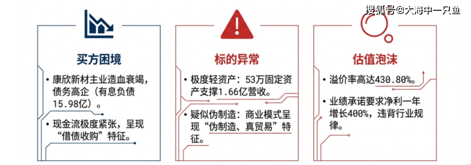 标的公司极低的固定资产(53万元)与其庞大的营收(1.66亿元)及“修复制造”定位或背离,业务实质极大概率为低门槛的贸易代理。畸高的存货(3.47亿元)与合同负债(2.49亿元)指向潜在的存货积压风险及融资性贸易行为,财务报表质量极低。430%的溢价率建立在违背经济规律的400%业绩增长承诺之上,或缺乏资产支撑。