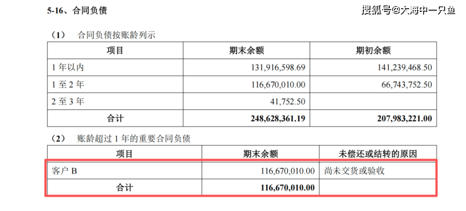 在标的公司的资产负债表中,最引人注目的莫过于高达2.49亿元的合同负债,其中对单一客户(客户B)的预收账款就达到了1.17亿元,且账龄长达1-2年。