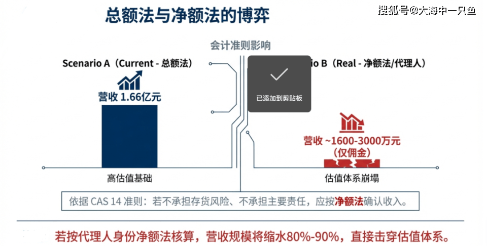 宇邦半导体目前的报表显然是按照总额法确认收入的(1.66亿元营收)。然而,如果其业务模式仅仅是“以销定采”,并未承担存货的实质性风险(如价格波动风险、滞销风险),或者其提供的修复服务仅为辅助性质,那么其身份更接近于代理人。若监管机构最终认定其应按净额法核算,标的公司的营收规模将瞬间缩水至原来的10%-20%(即毛利部分),这将对其估值产生毁灭性的打击。