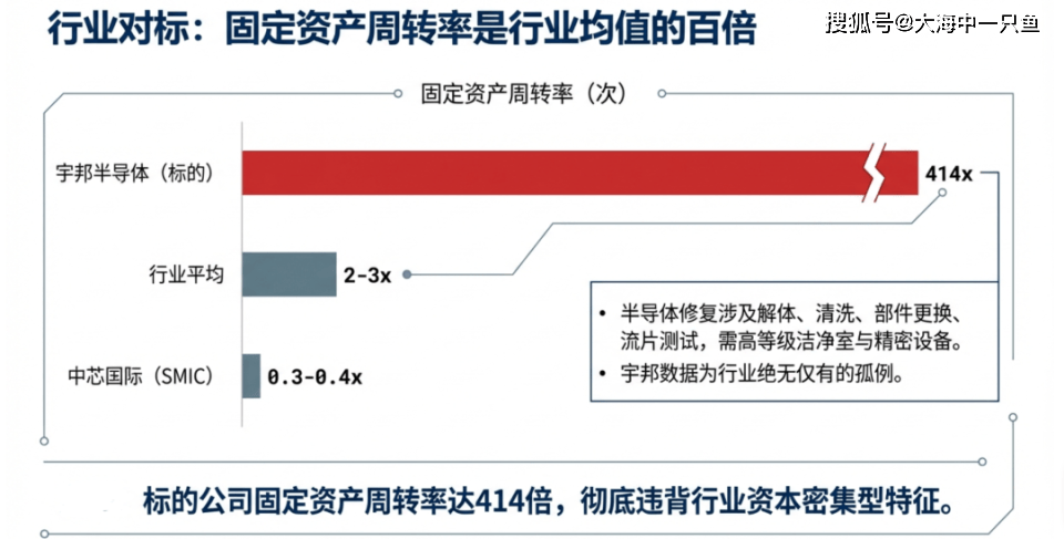 若据此计算,标的公司的固定资产周转率达到了惊人的414倍(2.2亿元 / 53.5万元)。这一数据在半导体行业中是绝无仅有的孤例。通过对比同行业可比公司及行业平均水平,我们可以更清晰地看到这种异常的程度: