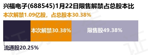 证券之星消息,根据市场公开信息整理,兴福电子(688545)于1月22日将有1.09亿股限售股份解禁,为公司首发原股东限售股份,首发战略配售股份,占公司总股本30.38%。(本次数据根据历史公告整理得出,实际情况以上市公司最新公告为准)最近一年内,该股累计解禁446.02万股,占总股本的1.24%。本次解禁后,公司还有1.78亿股限售股份,占总股本49.38%。具体如下图所示: