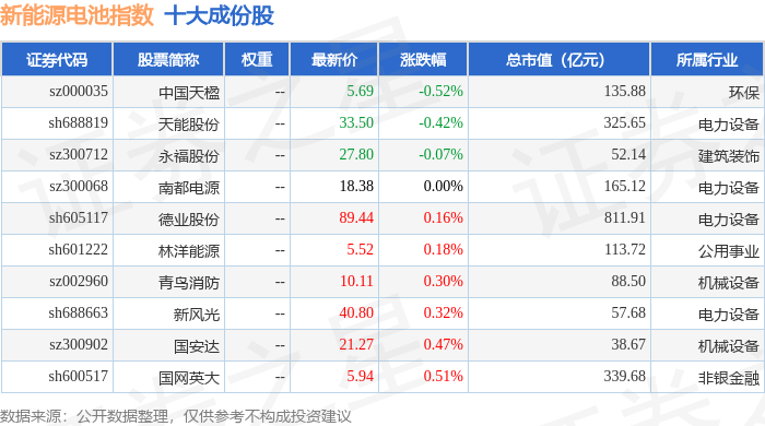 证券之星消息,12月17日,新能源电池(980027)指数报收于3362.4点,涨3.61%,成交526.06亿元,换手率2.02%。当日该指数成份股中,上涨的有46家,同飞股份以14.46%的涨幅领涨,下跌的有3家,中国天楹以0.52%的跌幅领跌。