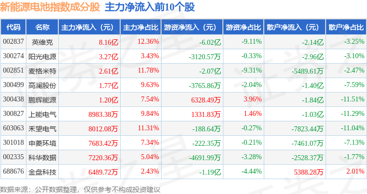 资金流向方面,新能源电池(980027)指数成份股当日主力资金净流入合计20.93亿元,游资资金净流出合计10.08亿元,散户资金净流出合计10.85亿元。成份股资金流向详情见下表: