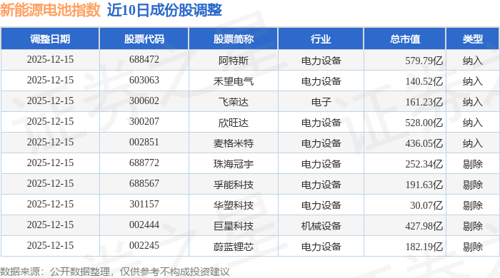 近10日内新能源电池(980027)指数成份股做了调整,新纳入了5只股票,剔除了5只股票。