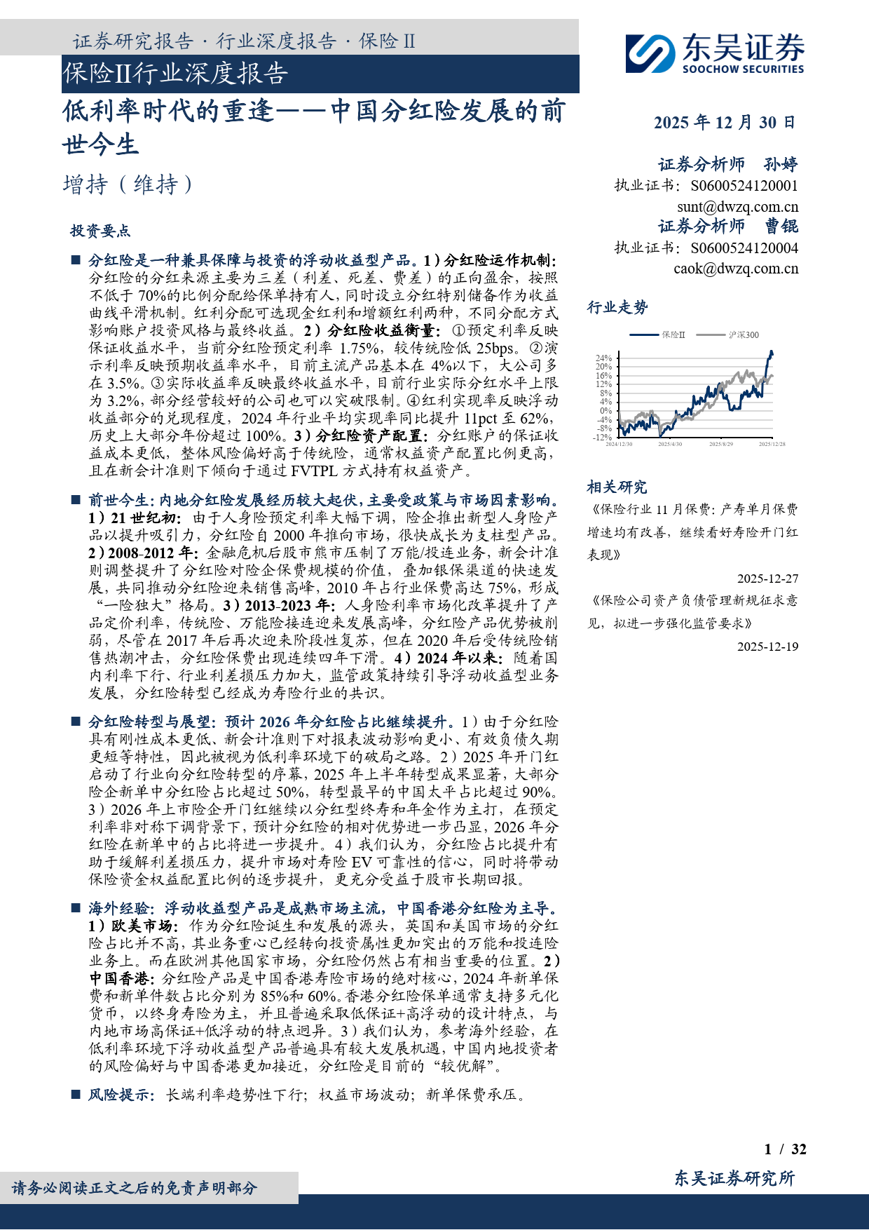 行业同时面临长端利率趋势性下行、权益市场波动、新单保费承压等风险。总体而言,在监管引导与市场需求双重驱动下,分红险已成为寿险行业低利率环境下的重要转型方向,其占比提升将重塑行业负债结构,推动行业向高质量发展转型,同时为保险资金权益投资带来长期增量空间。