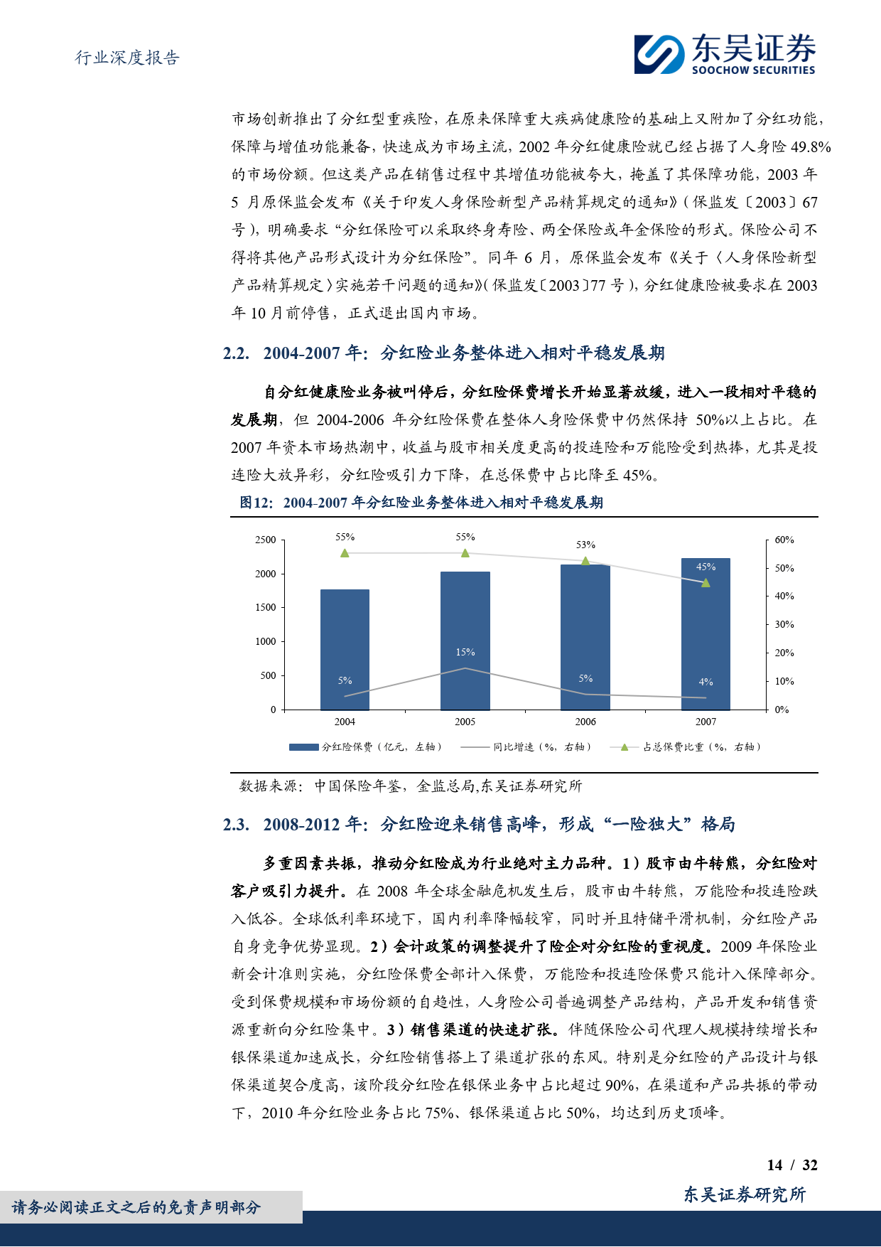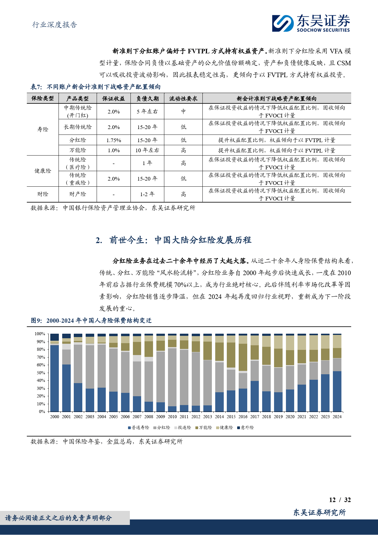 中国大陆分红险发展历经多轮起伏:21 世纪初因人身险预定利率下调应运而生;2008-2012 年受益于金融危机后股市熊市、新会计准则调整及银保渠道扩张,占行业保费比重达 75% 的 “一险独大” 格局;2013-2023 年受利率市场化改革影响,传统险、万能险相继崛起,分红险吸引力下降,保费连续四年下滑;2024 年以来,在国内利率下行、利差损压力加大背景下,监管政策持续鼓励浮动收益型产品,分红险转型成为行业共识。