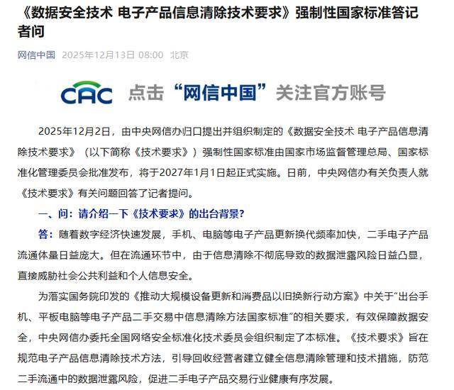 2025年12月2日,由中央网信办归口提出并组织制定的《数据安全技术 电子产品信息清除技术要求》(以下简称《技术要求》)强制性国家标准由国家市场监督管理总局、国家标准化管理委员会批准发布,将于2027年1月1日起正式实施。日前,中央网信办有关负责人就《技术要求》有关问题回答了记者提问。