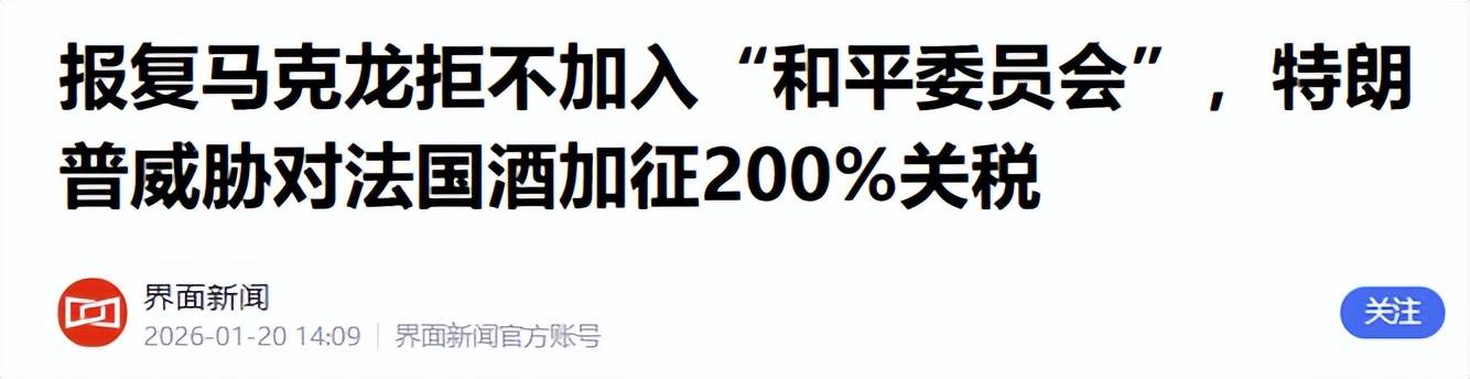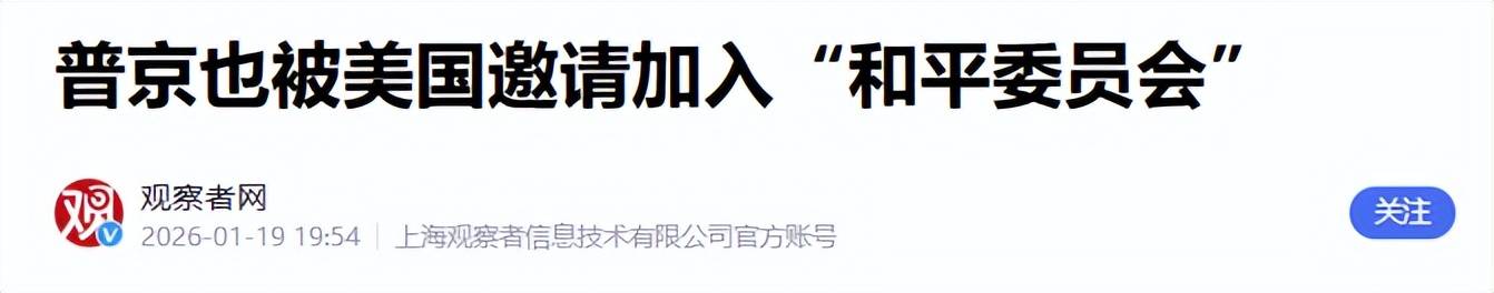 参考资料: 1.《美政府已邀约60国加入加沙和平委员会》2026-01-19 05:45 | 来源:央视新闻 2.《报复马克龙拒不加入和平委员会,特朗普威胁对法国酒加征200%关税》2026-01-20 14:09 | 来源:界面新闻 3.《普京也被美国邀请加入和平委员会》2026-01-19 19:54 | 来源:观察者网 4.《俄外长:俄中关系达到前所未有的水平和深度》2026-01-20 17:21 | 来源:环球网 5.《中方:已收到美方邀请》2026-01-20 15:58 | 来源:杭州日报