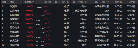 细分方向来看,半导体龙头显著领涨,长电科技、兆易创新、通富微电涨停,华润微涨超13%;光学光电子龙头方面,三安光电涨停;消费电子龙头方面,安克创新涨超5%,工业富联涨逾4%;印制电路板(PCB)方面,深南电路涨超4%,沪电股份涨逾1%。