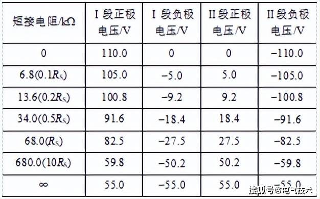 下面分析短接电阻R对控制母线电压的影响。此时,忽略充电机、蓄电池组与负荷不平衡性的影响,假设U1=U2=110 V,取RS=68 kW,将短接电阻R作为变量,根据式(1)~式(4)计算互窜时控制母线电压数值与短接电阻的关系,见表3。由表3可知,直流异极互窜时控制母线电压相对标称电压的偏移量主要取决于短接电阻R与平衡电阻Rs的比值:短接电阻为0,相当于金属性短路,Ⅰ段负极与Ⅱ段正极电压均为0;短接电阻无穷大时,相当于两套系统正常分列运行。