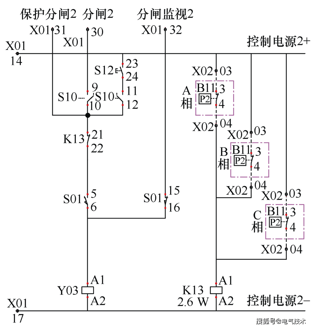 使用螺丝刀解开断路器机构箱中B、C相SF6表计接线盒辅助触点B11的X02:02(见图1),用万用表测量“控制电源1-”X01:15仍有+52 V电压。当解开图1中A相SF6辅助触点B11的X02:02时,“控制电源1-”X01:15的+52 V对地电压消失,因此确认A相SF6表计闭锁触点回路绝缘不良。