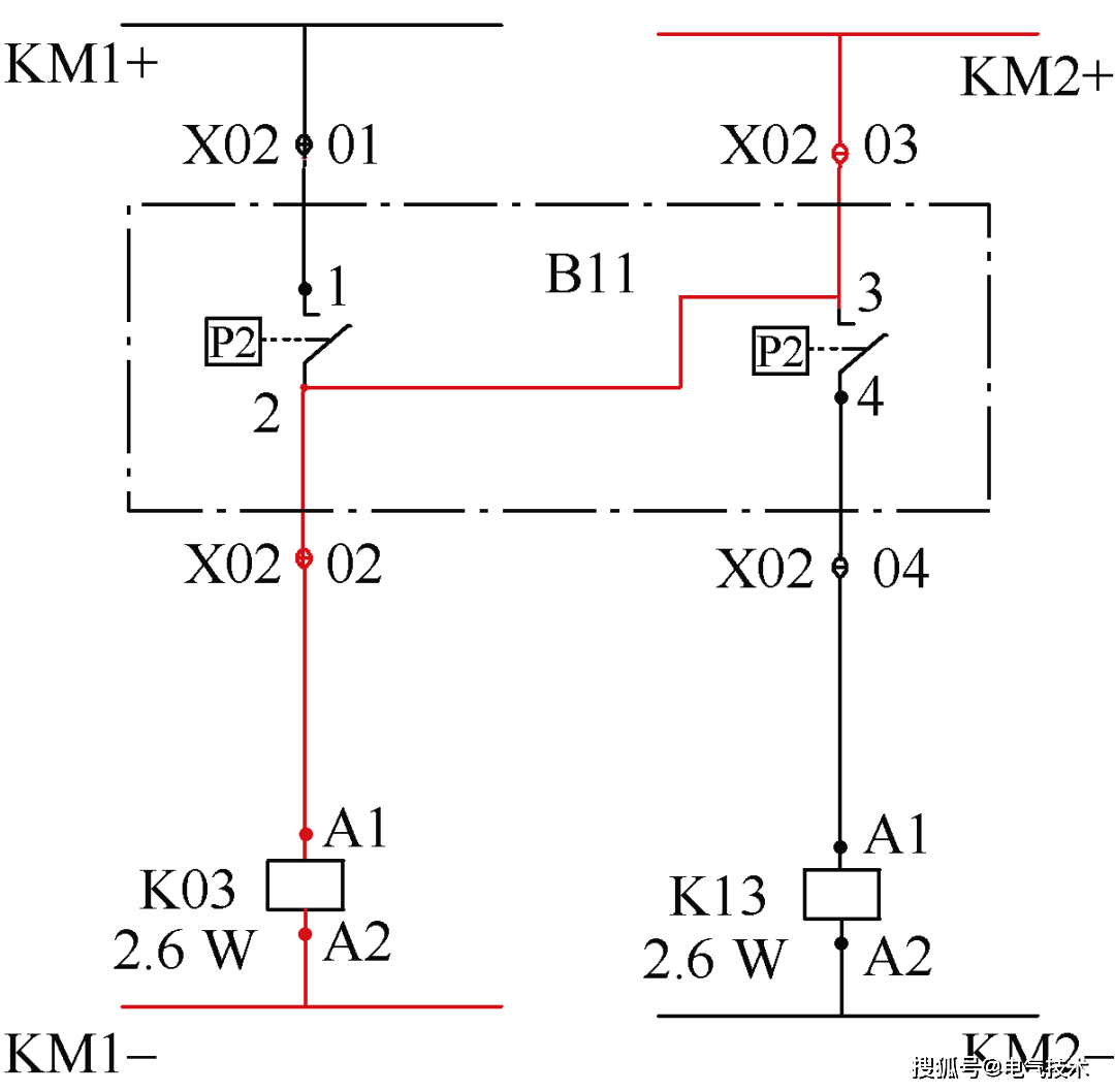 根据第2节故障分析过程,SF6表计B11的接线端子2与接线端子3短接,短接示意图如图8所示,即KM2+经B11的3、2触点和K03的线圈至KM1-,此时K03的线圈电阻即为短接电阻R。