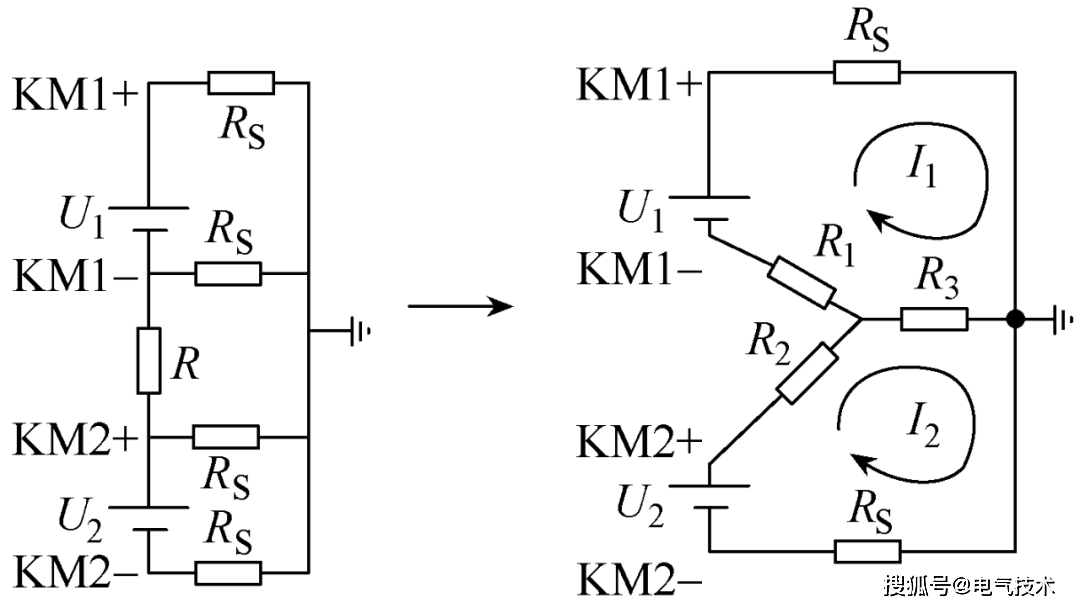 根据本次直流Ⅰ段负极与直流Ⅱ段正极窜电现象与绝缘监测原理,得到直流异极窜电等效电路模型如图5所示,其中R为未知的短接电阻,RS为绝缘监测装置的平衡桥内阻,出厂时确定,约为68 kW。本文所述直流系统标称电压均为110 V。