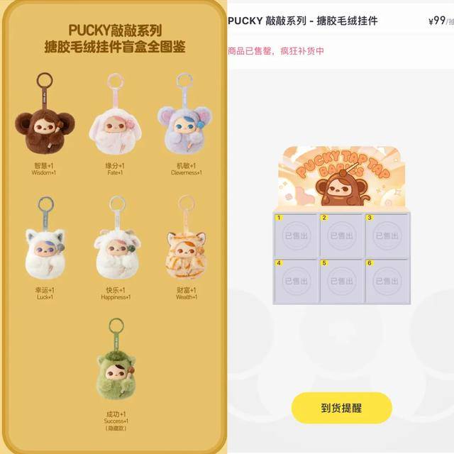 1月15日,泡泡玛特发售了一个新的搪胶毛绒系列——PUCKY敲敲系列。因为内置发声装置,轻敲毛绒挂件,会发出清脆的木鱼声,加上挂件取名寓意十足,叫“财富+1”“幸运+1”“快乐+1”,完美契合了年轻人“解压+祈福”的需求,该系列迅速走红,被网友戏称为“电子木鱼”。