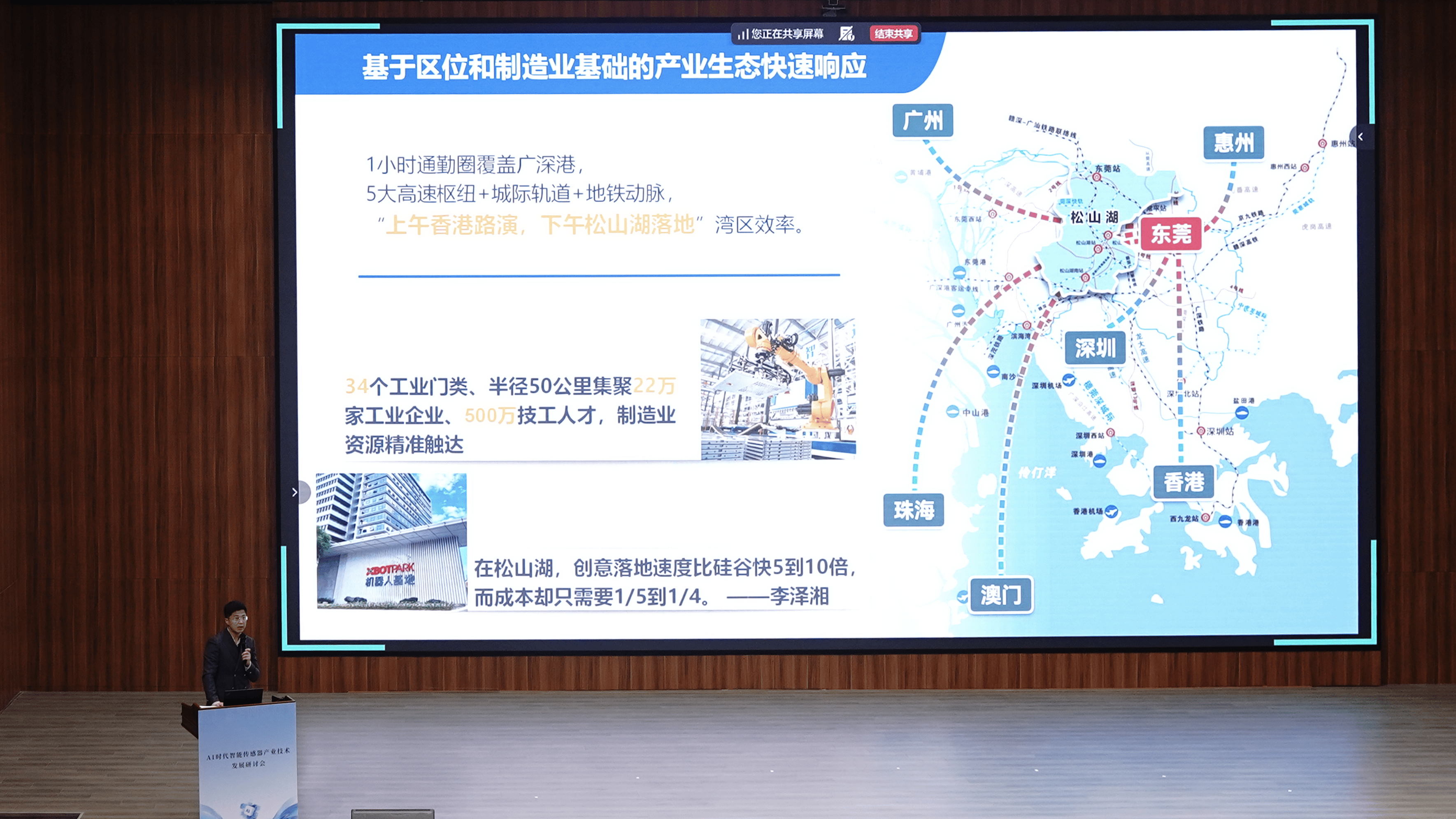 松山湖科学城集团产业开发公司副总经理吴思多详细介绍了松山湖的产业生态优势。他表示,松山湖科学城作为粤港澳大湾区综合性国家科学中心先行启动区,拥有快速响应的供应链体系、丰富的应用场景、专业的产业空间以及覆盖“基础研究-技术攻关-中试量产”的全链条服务能力,正全力打造智能传感器产业集聚发展的高地。
