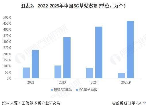 2024年,我国5G基站建设持续增长。根据工信部统计,2024年我国新建5G基站87.4万个,累计建成并开通5G基站425.1万个。截至2025年9月,中国5G基站总数达到470.5万个。