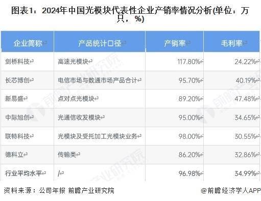 根据我国代表性光模块企业的数据,2024年,我国光模块行业平均产销率水平较高,达96.98%;行业平均毛利率水平为34.99%,总体盈利情况良好。其中,的光模块产销率超过100%。